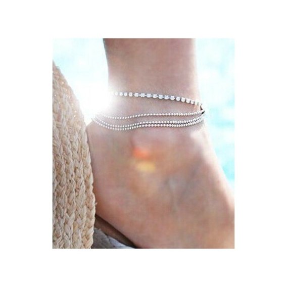 BRANSOLETKA NA STOPĘ Delikatna i efektowna bransoletka na stopę  Materiał:metal nieszlachetny nie zawierający chromu i niklu Wymiary:długość: 21,5 cm plus 5 cm regulacji Kolor:SrebrnyZapięcie:karabińczyk