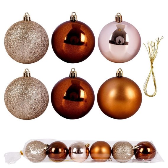 • ŚWIĄTECZNE - Zestaw 6 sztuk bombek wraz ze sznureczkiem do zawieszenia. Każda z bombek ma średnicę 7 cm. W zestawie bombki w kolorze perłowym i bursztynowym w wersji błyszczącej, brokatowej oraz matowej.