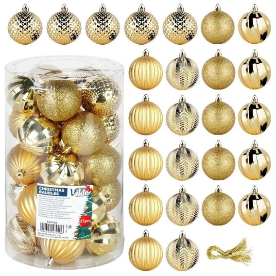 Zestaw 25 sztuk nietłukących bombek. W zestawie: 5x bombki brokatowe, 6x bombki matowe wytłaczane, 15 x bombki błyszczące wytłaczane (mix 3 wzorów), 5x bombki matowe wytłaczane. Bombki prezentują się bardzo efektownie. Niezbędne do dekoracji choinek, kompozycji świątecznych i stroików. Będą stanowić wyjątkową ozdobę na choince. Z ich pomocą możemy w modnym stylu ubrać swoje drzewko świąteczne.