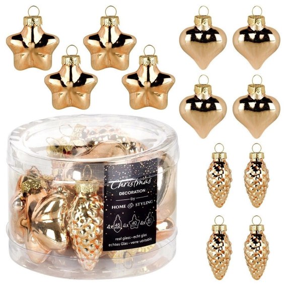 Zestaw 12 sztuk szklanych bombek. W zestawie: 4x złote bombki gwiazdki (4 x 4 cm), 4x złote bombki serduszka (4 x 4,5 cm), 4x złote bombki szyszki (4,5 x 2 cm). Bombki prezentują się bardzo efektownie. Niezbędne do dekoracji choinek, kompozycji świątecznych i stroików. Będą stanowić wyjątkową ozdobę na choince. Z ich pomocą możemy w modnym stylu ubrać swoje drzewko świąteczne.
