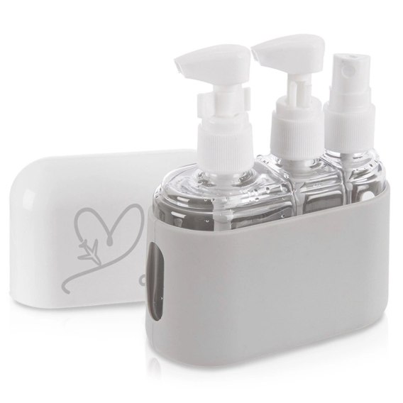 Pojemniki podróżne na kosmetyki w zamykanym etui. Znakomicie sprawdzą się podczas podróży samolotem, gdzie nie można zabrać na pokład pełnowymiarowych kosmetyków. Przydadzą się także do zabrania małej ilości kosmetyków na podróż, kemping, wycieczkę, a także do pracy czy na uczelnię. Wykonane z wytrzymałych materiałów.