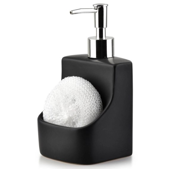 Dozownik płynu do mycia naczyń wraz z miejscem na gąbkę i gąbką w zestawie. Do zastosowania w łazience lub kuchni. Dozownik ma klasyczny, a zarazem elegancki wygląd. Pasuje do wnętrz w stylu nowoczesnym, klasycznym, loft czy też industrialnym.