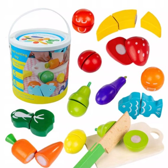 Praktyczny i bezpieczny zestaw drewnianych owoców i warzyw do krojenia, który z pewnością zainteresuje każde dziecko powyżej 3 lat. Elementy wykonane są z naturalnego drewna, pomalowane nietoksyczną farbą, pozbawione ostrych krawędzi.