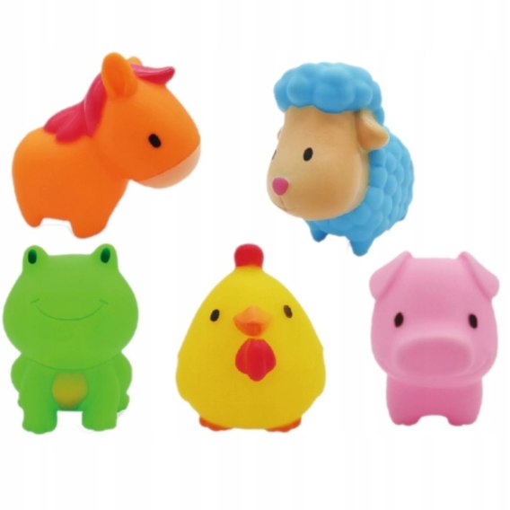 W zestawie znajduje się 5 gumowych zwierzątek: konik, kurczaczek, baranek, świnka i żabka.