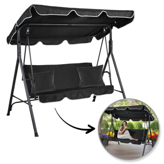 Huśtawka ogrodowa 3-osobowa z baldachimem i 2 poduszkami, czarna HO01CZ