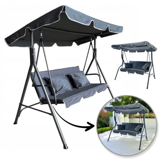 Huśtawka ogrodowa 3-osobowa z baldachimem i 2 poduszkami, grafitowa HO01