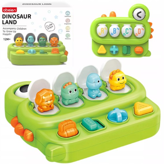Ta urocza zabawka w kształcie głowy dinozaura została stworzona z myślą o najmłodszych. Dzieci mogą naciskać, przekręcać lub przesuwać kolorowe przyciski, a wtedy z ukrycia wyskakują uśmiechnięte dinozaury, co na pewno sprawi im mnóstwo radości.