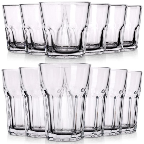 <li><strong>PRZYDATNE</strong> - Zestaw dwunastu szklanek do napojów w dwóch różnych rozmiarach. W zestawie: 6x szklanka mała (o pojemności całkowitej 230 ml, wysokości 8,5 cm i średnicy 8,5 cm) oraz 6x szklanka duża (o pojemności całkowitej 330 ml, wysokości 12 cm i średnicy 8,5 cm).</li>