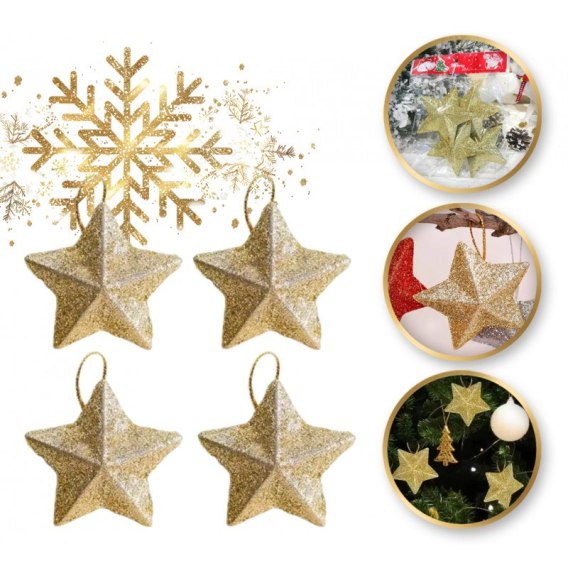 Komplet zawieszek choinkowych, GWIAZDKI brokatowe 4 sztuki 7cm złote BSN54