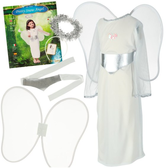 Kompletny zestaw gotowy do użycia: sukienka z paskiem, skrzydła oraz opaska z aureolą tworzą spójną stylizację bez konieczności dokupowania dodatków