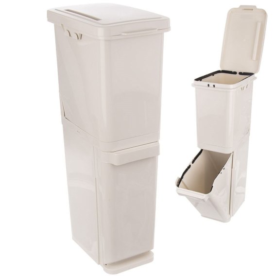 DWUPOZIOMOWY - Kosz łączony składający się z dwóch osobnych pojemników na odpady. Kosze można użytkować osobno lub wygodnie piętrując jeden na drugim, co znacząco ułatwi segregację odpadów. Wymiary całkowite kosza wynoszą 37 x 23 x 75 cm. Każdy z koszy ma pojemność 17,5 litra, co łącznie daje 35 litrów pojemności.