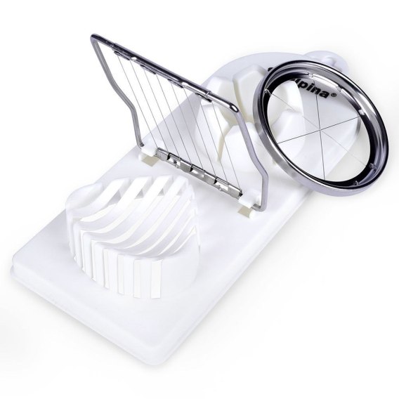 Krajalnica zapewni wygodne plastrowanie jajka oraz krojenie go na ćwiartki. Ergonomiczna konstrukcja, wykonana z trwałych materiałów. Z jej pomocą równomiernie pokroimy jajko, możemy wykorzystać ją również do krojenia owoców lub warzyw. Oryginalny produkt holenderskiej marki Alpina. Wyprodukowano zgodnie z europejskimi standardami.