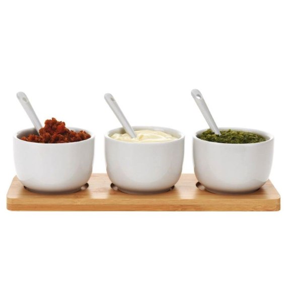 Zestaw trzech miseczek na bambusowej tacy z łyżeczkami. Wymiary całkowite zestawu wynoszą 21 x 7,5 cm. Wykorzystamy je do serwowania przekąsek, przystawek, sosów i dipów. W zestawie: 3x miseczka 90 ml (6,5 x 6,5 x 5 cm), 3x łyżeczka (długość 10 cm), 1x deska bambusowa (21 x 7,5 cm). Zestaw pięknie prezentuje się na stole. Serwowane sosy lub przekąski są umieszczone w jednym miejscu i w łatwy sposób można je nałożyć dzięki zawartym w zestawie łyżeczkom. Wyprodukowano zgodnie z europejskimi standardami.