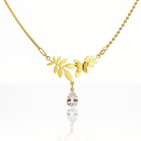 Naszyjnik stal szlachetna pozłacana 14k złotem, listki, motyl, cyrkonia NST2212