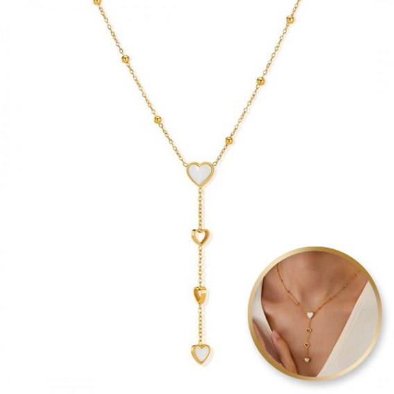 Naszyjnik stal szlachetna pozłacana 14k złotem, zwisający, serca masa perłowa NST2151