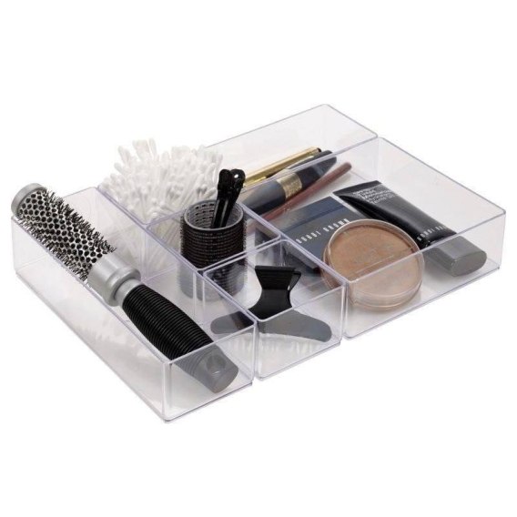 Praktyczny organizer w skład którego wchodzi sześć pojemników. W zestawie:1x pojemnik (15 x 15 x 5 cm), 1x pojemnik (15 x 7 x 5 cm), 1x pojemnik (22,5 x 7 x 5 cm), 3x pojemnik (7 x 7 x 5 cm). Organizer możemy wykorzystać do przechowywania kosmetyków, akcesoriów do wykonywania paznokci, ale również świetnie sprawdzi się do przechowywania biżuterii. Z jego pomocą zachowamy ład i porządek a nasza biżuteria i kosmetyki będą miały swoje miejsce. Przydatny w każdym domu oraz gabinecie kosmetycznym. Wyprodukowano zgodnie z europejskimi standardami.