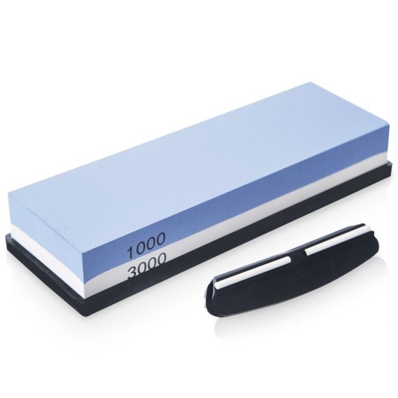 PRAKTYCZNA- Ostrzałka składa się z dwóch warstw: niebieskiej o gradacji 1000 do ostrzenia oraz białej o gradacji 3000 do polerowania. Zamocowanie prowadnicy na ostrzonym nożu zapewnia prawidłowy kąt ostrzenia noża (15-20°).
