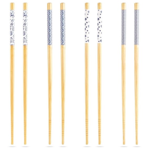 Zestaw czterech par pałeczek do sushi. Pałeczki wykonane są z drewna bambusowego i posiadają efektowny dekor. Każda para posiada inny nadruk, dzięki czemu można bez problemu odróżnić swoją parę pałeczek podczas jedzenia sushi w gronie znajomych. Pałeczki z jednej strony wykończone eleganckim zdobieniem a z drugiej strony karbowane końcówki, aby chwyt potrawy był pewniejszy. Pałeczki wykorzystamy do jedzenia różnego rodzaju dań kuchni azjatyckiej. Wyprodukowano zgodnie z europejskimi standardami.