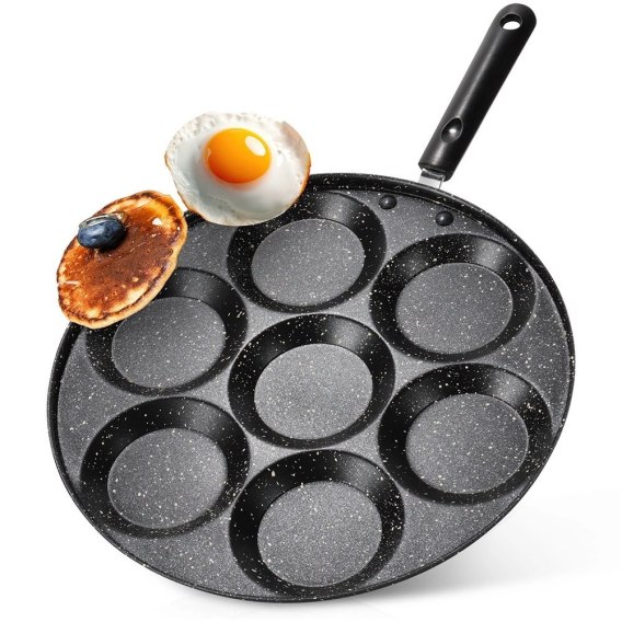 Nieprzywierająca patelnia do jajek o wyjątkowym, ponadczasowym wyglądzie. Patelnia utrzymana w modnym stylu, dzięki czemu efektownie prezentuje się w kuchni. Otwory pozwolą uzyskać okrągły kształt potraw. Z jej pomocą usmażymy pyszne jajka sadzone, ulubione placuszki śniadaniowe czy mini naleśniki. Wykonana z najwyższej jakości materiałów, odpowiednio użytkowana posłuży długie lata.