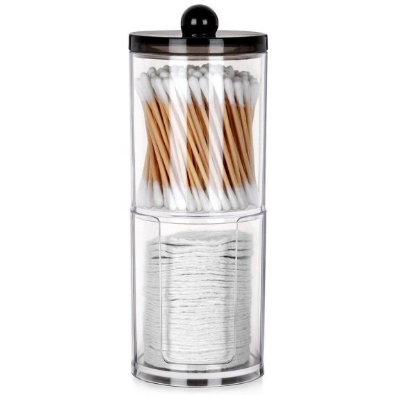 Dwupoziomowy pojemnik na patyczki lub płatki kosmetyczne to praktyczny dodatek do łazienki. Zestaw wyróżnia się nowoczesnym, prostym wzornictwem, które doskonale wpasowuje się w wystrój każdej łazienki. Przezroczysty kolor pozwala zobaczyć, ile patyczków lub płatków zostało.