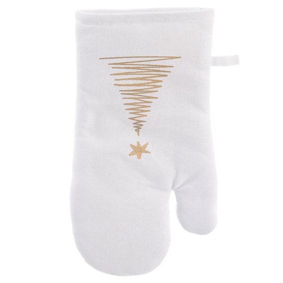 Rękawica kuchenna wykonana z bawełny ze świątecznym motywem. Wyposażona w pętelkę do zawieszenia oraz magnes. Wygodna w użytkowaniu, odpowiednio przylega do dłoni chroniąc ją podczas gotowania lub pieczenia przed oparzeniami. Z pomocą rękawicy bez problemu przeniesiemy gorące naczynia.