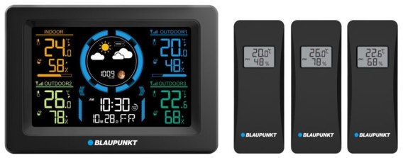 Stacja pogodowa z trzema czujnikami bezprzewodowymi do pomiaru temperatury i wilgotności, odczytem bezwzględnego ciśnienia atmosferycznego, wskaźnikiem trendu temperatury i wilgotności, zegarem i kalendarzem oraz funkcją alarmu, a także wyświetlaniem faz księżyca. Zasilana za pomocą dostarczonego zasilacza sieciowego lub opcjonalnych baterii.