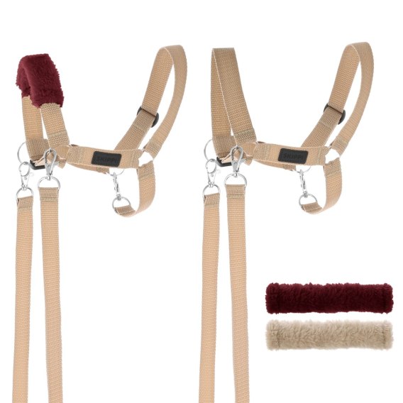 Uniwersalny beżowy kantar z wodzami i dwoma futerkami w kolorze bordowym i beżowym.