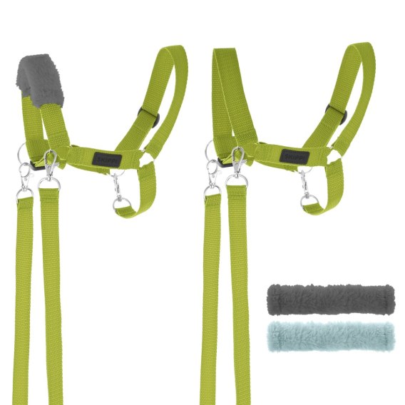 Uniwersalny jasnozielony kantar z wodzami i dwoma futerkami w kolorze szarym i błękitnym.