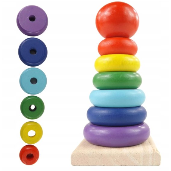 Zabawa polega na układaniu na pałąku obręczy od największej do najmniejszej lub na odwrót. Rozwija to zdolności manualne i koordynację ruchową dziecka. Zabawka posiada różnokolorowe elementy, zapewnia to naukę pierwszych kolorów.
