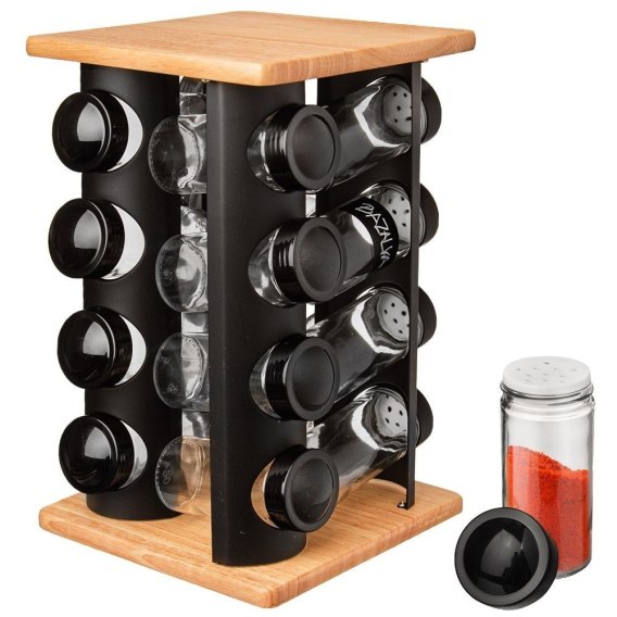 Stojak na Przyprawy Obrotowy BLACK Czarny Metal Drewno 16 Słoików ORION
