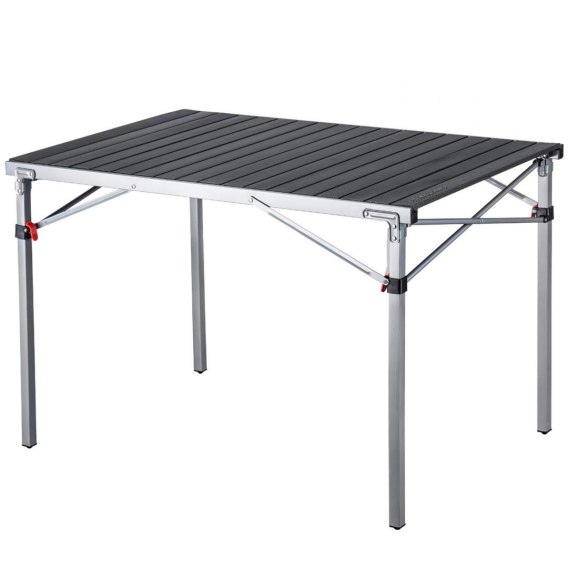 Trójkątna stalowa konstrukcja czyni stół bardzo stabilnym. Blat stołu wykonany jest z paneli aluminiowych, nierdzewnych, odpornych na korozję i łatwych do czyszczenia. Nośność stołu kempingowego wynosi 80 kg.
