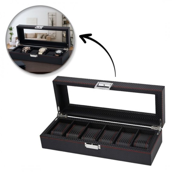 Szkatułka pudełko na zegarki 6szt, etui, Karbon czarny, czerwone przeszycia, szkło PD59