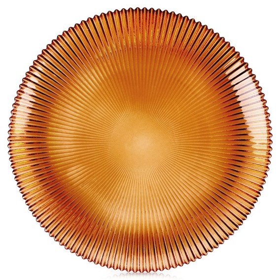 Wykonany z najwyższej jakości szkła w bursztynowym kolorze. Talerz charakteryzuje się wyjątkowym wzorem promieni, które rozchodzą się od środka, tworząc efektowny, stylowy wygląd. Odpowiednio użytkowany posłuży długie lata.