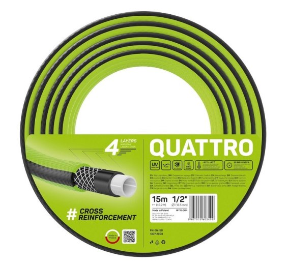 Wąż ogrodowy QUATTRO to dobrej jakości produkt. Posiada 4 warstwy, skomponowane w taki sposób, aby zapewnić mu elastyczność i odporność na skręcanie. Ich ilość i grubość dobrano tak, aby chroniły go przed działaniem czynników zewnętrznych.