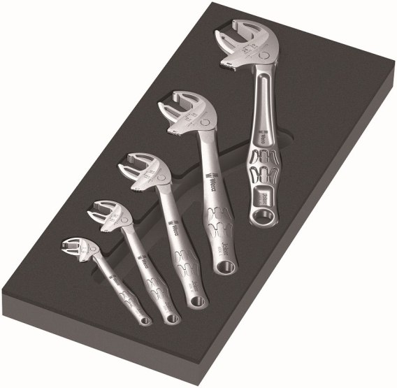 Trwała wkładka piankowa dwukolorowa, umożliwiająca szybką identyfikację brakujących elementów pasuje do wózka warsztatowego Tool Rebel wyposażona w 5 samonastawnych kluczy płaskich Wera 6004 Joker.
