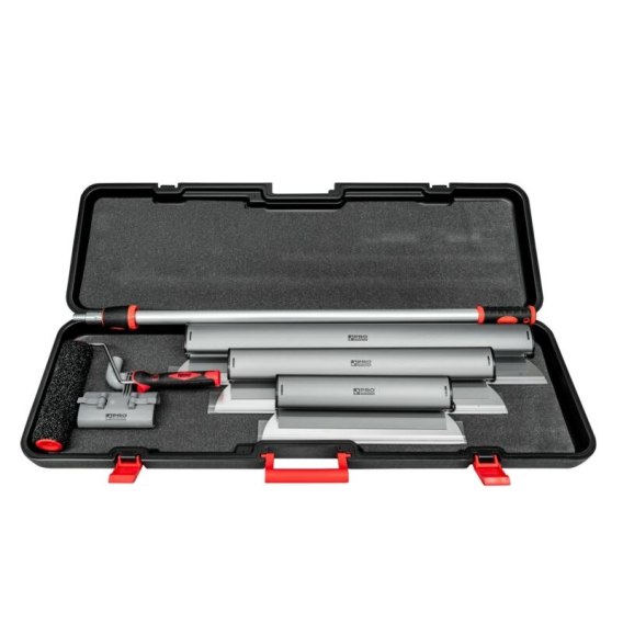 Adapter i przedłużka teleskopowa, umożliwiająca szpachlowanie wyższych powierzchni np. sufitów i ścian Wałek o szerokości 22 cm do nakładania gładzi z dwukomponentowym uchwytem Walizka o długości 110cm wykonana z wytrzymałego tworzywa odpornego na uderzenia i wstrząsy