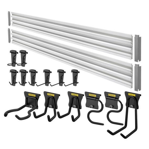 Zawiera: 2 x 4 stopy / 121 cm x 5,5 "kawałka szyny ściennej STANLEY®, 4 x zaślepki, 2 x krótkie haki ogólnego zastosowania, 2 x zakrzywione haki obrotowe, 1 x długi hak ogólnego przeznaczenia, 1 x hak na sprzęt zewnętrzny, 8 x zatrzaski