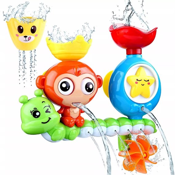 Zabawka wodna w kształcie małpki z gąsienicą i gwiazdką.Dziecko za pomocą dołączonego kubeczka wlewa wodę do czapki małpki, która w trakcie zabawy ma wirujące oczy i otwierającą się buzię, przez którą wypływa woda do wanny.