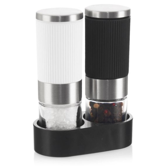 <li><strong>FUNKCJONALNE</strong> - Młynki umożliwiają regulowanie grubości mielenia za pomocą pokrętła. Wyposażone są w pokrywkę zapobiegającą wysypywaniu się resztek zmielonej przyprawy. Sprawdzą się do mielenia pieprzu oraz podawania soli. Stojak ułatwia przechowywanie pojemników i utrzymanie porządku na kuchennych blatach czy stole.</li>