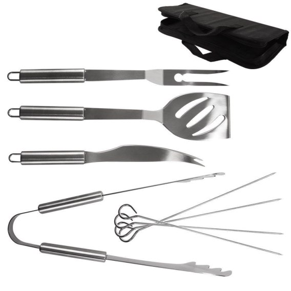 WYTRZYMAŁE - Przybory do grillowania wykonane z wysokiej jakości stali nierdzewnej w kolorze srebrnym. Nadają się do mycia w zmywarce do naczyń. Zestaw opakowany w zamykane na zamek błyskawiczny etui z uchwytem.