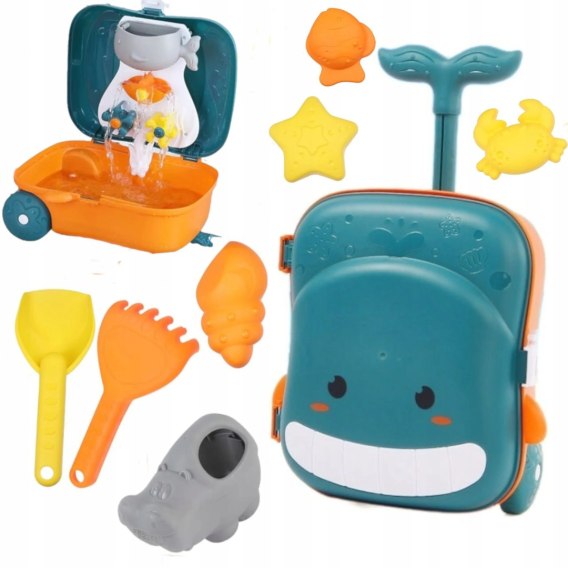 Walizka jest super dodatkiem, dzięki niej dziecko może zapakować ulubione zabawki na plażę i same prowadzić walizkę. Uchwyt walizki jest regulowany. Walizka zamykana jest na zatrzask.