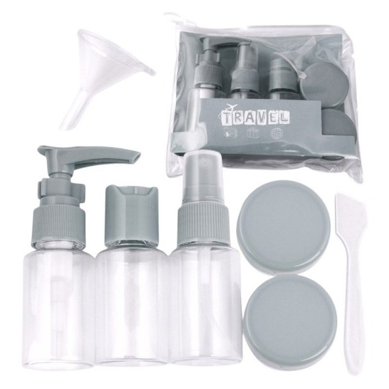 7-częściowy zestaw buteleczek i pojemniczków, specjalnie zaprojektowanych do przewożenia kosmetyków w podróży.