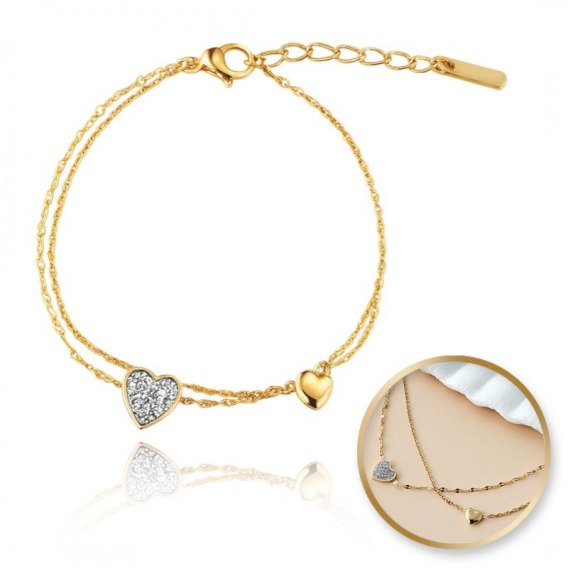 Bransoletka podwójna na rękę stal chirurgiczna pozłacana 14k złotem, serca, cyrkonie - BST1549
