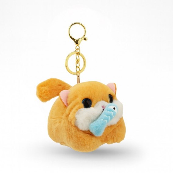 Brelok do kluczy - Kot łapiący rybę z kręconym ogonkiem, kremowy BRL398K