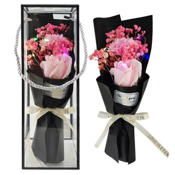 Bukiet zapachowych kwiatów mydlanych w pudełku, róże na prezent, świecące LED BUK08