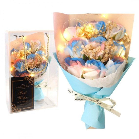 Bukiet kwiatów zapachowych kwiatów mydlanych w ozdobnym pudełkuSubtelny i wyjątkowy prezent dla kobiety, idealny na wiele okazji.Bukiet kwiatów mydlanych jest umieszczony w ekskluzywnym opakowaniu, ozdobionym subtelnymi zdobieniami i kokardą.Gotowy do wręczenia jako prezent dla Twojej ukochanej osoby.Każda róża mydlana jest starannie wykonana, aby oddać piękno prawdziwego kwiatu.Specyfikacja:- Wytrzymała, transparentna kopuła,- Podstawa z tworzywa sztucznego,- Wewnątrz światełka LED, 3 tryby świecenia, baterie w zestawie- Możliwość włączania i wyłączania lampek.Materiał: kwiaty mydlane / opakowanie z tworzywa sztucznego.Wymiary:Wysokość: około 26 cmSzerokość bukietu: około 11 cmWymiary pudełka:28cm x 18cm x 10cmWaga bukietu:62gWaga produktu z pudełkiem:  156g