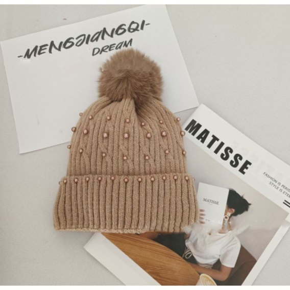 Czapka zimowa dzianinowa z pomponem i perełkami jasny brąz CZ35WZ3