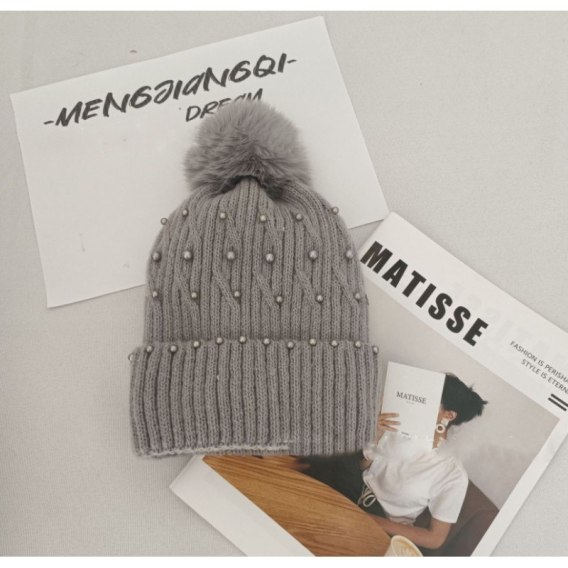 Czapka zimowa dzianinowa z pomponem i perełkami szara CZ35WZ2