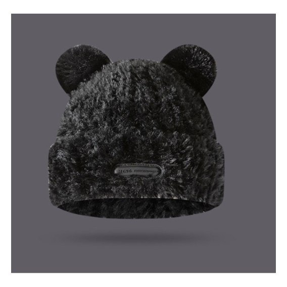 Czapka zimowa pluszowa z uszami misia, z naszywką, czarna CZ32WZ5