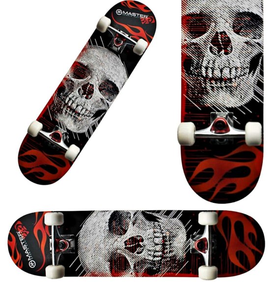 Młodzieżowa deskorolka MASTER Extreme Board Skull to świetny wybór zarówno dla początkujących  jak i zaawansowanych skateborderów. Trwała i solidna wykonana z 9 warstw konstrukcja jest lekka i świetnie nadaję się do nauki i wykonywania wszelkiego rodzaju trików. Poliuretanowe kółka na łożyskach ABEC7 zapewnią nam szybkość i płynność jazdy. Modny i młodzieżowy design na pewno będzie odpowiadał najbardziej wymagającym gustom.